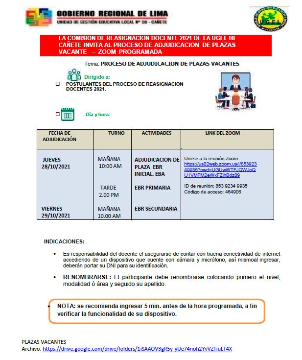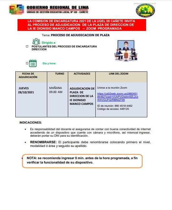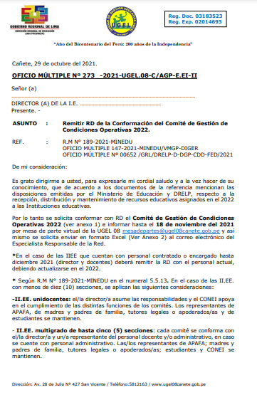 Vie, 29 de octubre, 2021 San Vicente Cañete.Remitir RD de la Conformación del Comité de Gestión de Condiciones Operativas 2022. DESCARGAR OFICIO: https://drive.google.com/file/d/1gcfJB46u0F054inmyb53-9kMYEk6c5FC/view?usp=sharing