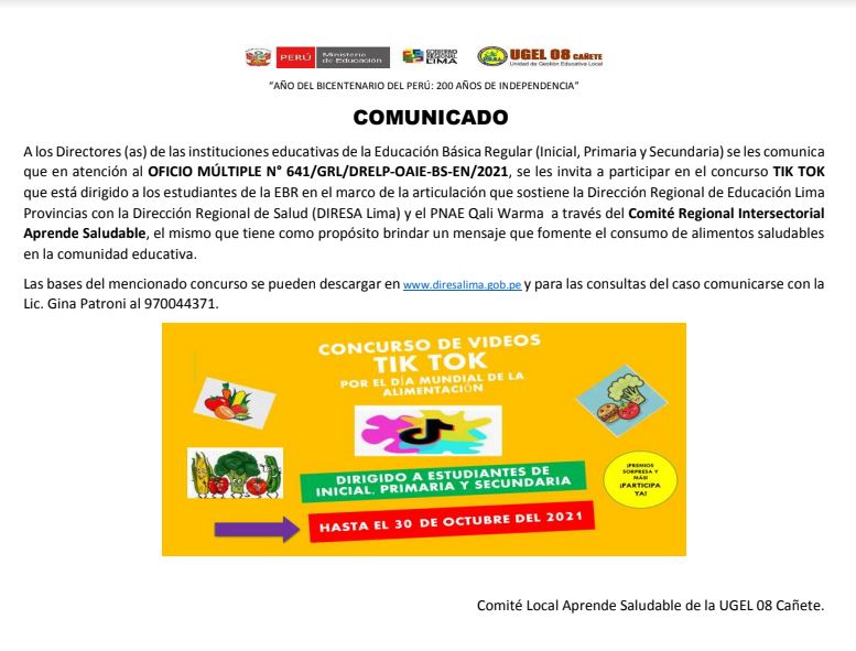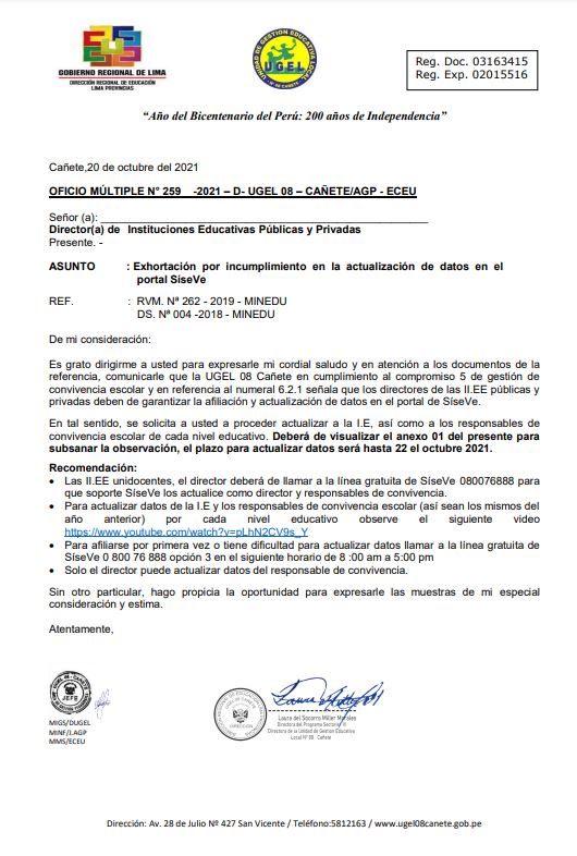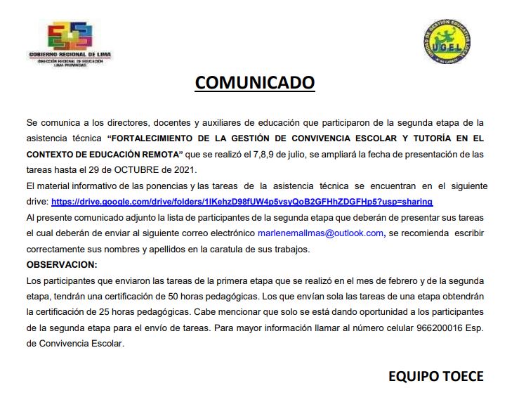 Sáb, 23 de octubre, 2021 San Vicente Cañete.MODIFICACION DE CRONOGRAMA REGIONAL DE ACTIVIDADES PARA EL PROCESO DE REASIGNACION POR LAS CAUSALES DE INTERES PERSONAL Y UNIDAD FAMILIAR 2021, EN EL MARCO DE LA LEY N° 29944 LEY DE REFORMA MAGISTERIAL Y SU REGLAMENTO. DESCARGAR OFICIO: https://drive.google.com/file/d/1vih7RmweQgwGfIY8YKaJrrhcBgJNUyec/view?usp=sharing