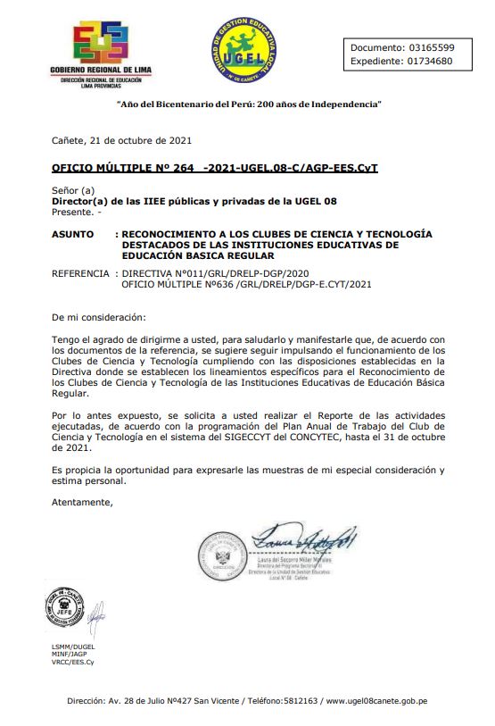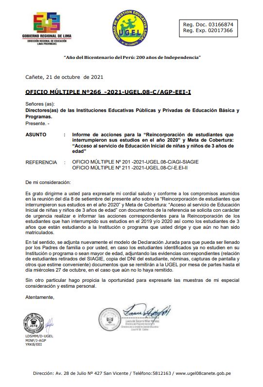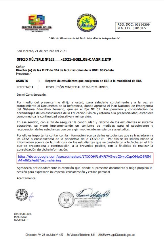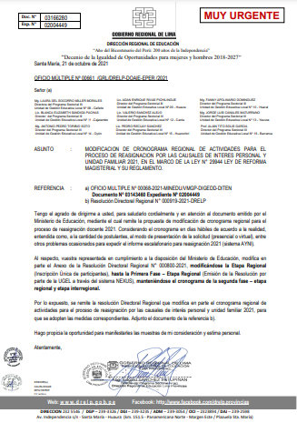 OFICIO MÚLTIPLE Nº 00661 /GRL/DRELP-DOAIE-EPER /2021