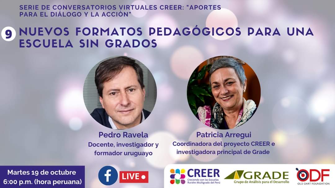 Lun, 18 de octubre, 2021 San Vicente Cañete.Este martes 19 de octubre a las 6:00 p.m. no se pierdan nuestro noveno conversatorio donde tendremos como invitado al docente, investigador y formador uruguayo, Pedro Ravela, para dialogar sobre nuevos formatos pedagógicos para una escuela sin grados. Moderará nuestra coordinadora, Patricia Arregui. 📌Inscripciones: https://forms.gle/kYBjD8qavtiGps5W¡Les esperamos! Vía nuestro #FacebookLive.https://www.facebook.com/108857457316457/posts/413017790233754/