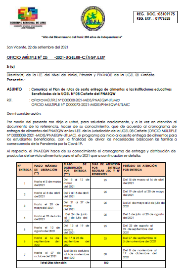 Mié, 22 de septiembre, 2021 San Vicente Cañete.Comunica el Plan de rutas de sexta entrega de alimentos a las instituciones educativas Beneficiadas de la UGEL Nº 08 Cañete del PNAEQW DESCARGAR OFICIO: https://drive.google.com/file/d/1URsmra76Bjl6D5jpVsp_1vBCOwKPZhWZ/view?usp=sharing