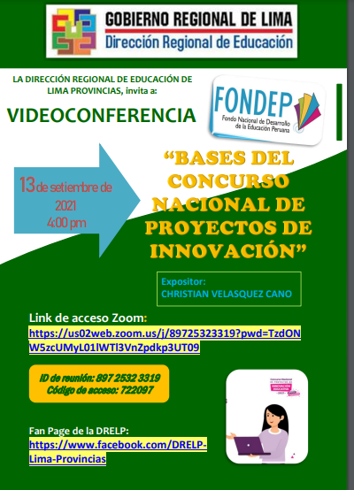 Leer mas...«BASES DEL CONCURSO NACIONAL DEL PROYECTOS DE INNOVACIÓN» DESCARGAR LAS BASES:https://drive.google.com/file/d/1cZuujmMviB1f6pxzjzxsJkR_jJK86v-x/view?usp=sharing