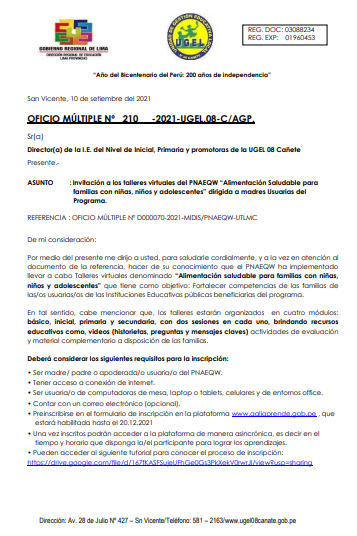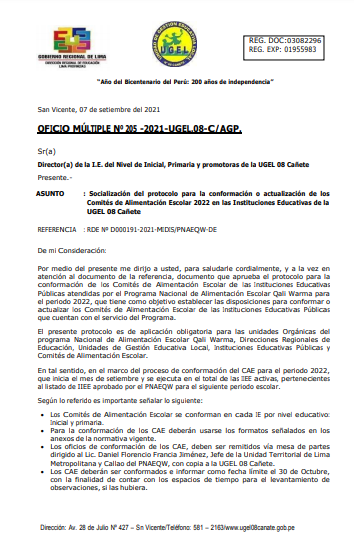 Leer mas...Socialización del protocolo para la conformación o actualización de los Comités de Alimentación Escolar 2022 en las Instituciones Educativas de la UGEL 08 Cañete DESCARGAR OFICIO: https://drive.google.com/file/d/14hBX59gQDmx0oMkS57XilcwDSgDX488K/view?usp=sharing