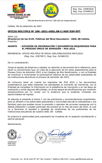 Leer mas...DIFUSIÓN DE INFORMACIÓN Y DOCUMENTOS REQUERIDOS PARA EL PROCESO ÚNICO DE ADMISIÓN – PUA 2022. DESCARGAR OFICIO: https://drive.google.com/file/d/1TcgC4dckFZVTcwazXMhC9jFuT00VfWKY/view?usp=sharing