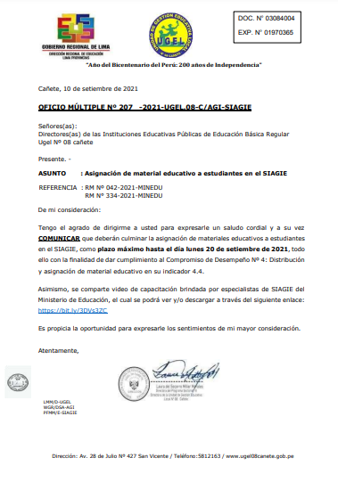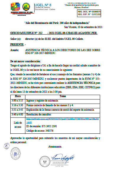 Leer mas...ASISTENCIA TÉCNICA A LOS DIRECTORES DE LAS IIEE SOBRE RSG N° 326-2017-MINEDU. DESCARGAR OFICIO: https://drive.google.com/file/d/1o95g7i2G8z6y6cfFceNuv2p_Cq_FSl9E/view?usp=sharing