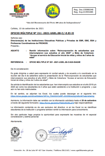 Leer mas...Remitir información sobre “Reincorporación de estudiantes que interrumpieron sus estudios el año 2020” y Meta de Cobertura: “Acceso al servicio de Educación Inicial de niñas y niños de 3 años de edad” DESCARGAR OFICIO: https://drive.google.com/file/d/1v2E6XeJ9X8c-m5kYcYz_RJ2xMrnH47FC/view?usp=sharing
