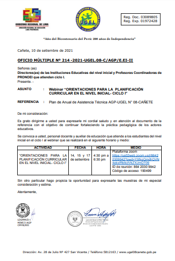 Leer mas...Webinar “ORIENTACIONES PARA LA PLANIFICACIÓN CURRICULAR EN EL NIVEL INICIAL- CICLO I” DESCARGAR OFICIO: https://drive.google.com/file/d/13EIWqsNuuAWxS9nkTyzLN54DR-QJcN-r/view?usp=sharing