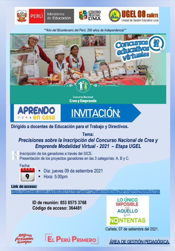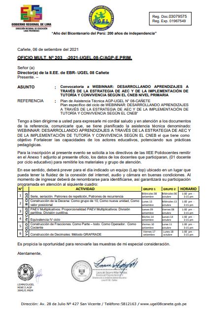 Leer mas...Convocatoria a WEBINNAR: DESARROLLANDO APRENDIZAJES A TRAVÉS DE LA ESTRATEGIA DE AEC Y DE LA IMPLEMENTACIÓN DE TUTORÍA Y CONVIVENCIA SEGÚN EL CNEB NIVEL PRIMARIA DESCARGAR OFICIO: https://drive.google.com/file/d/1qAbbxD8rMXV8q0nhIUch6feDedaqN83u/view?usp=sharing