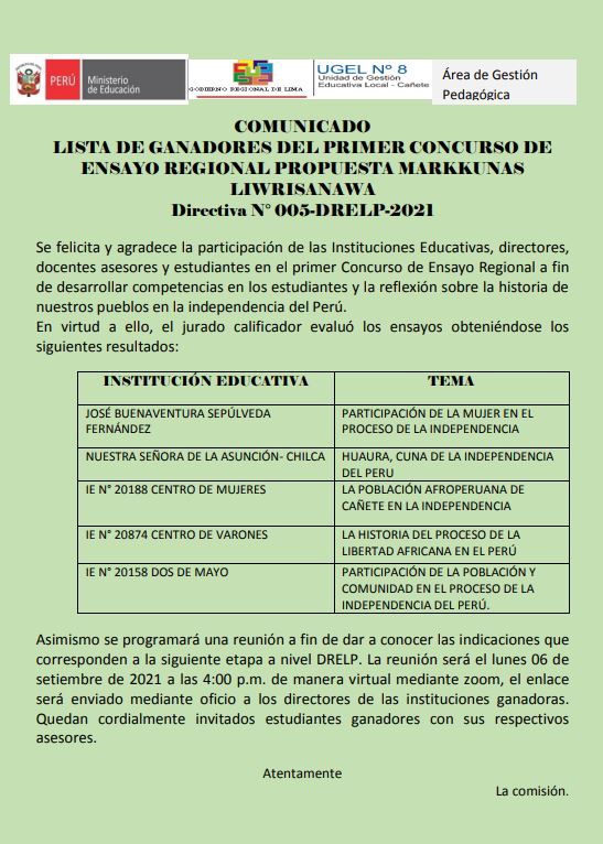 Leer mas...LISTA DE GANADORES DEL PRIMER CONCURSO DE ENSAYO REGIONAL PROPUESTA MARKKUNAS – LIWRISANAWA Directiva N° 005-DRELP-2021 DESCARGAR COMUNICADO: https://drive.google.com/file/d/10RGS8a861bRbJKvTXODZ8RVRcCD2TZ_0/view?usp=sharing