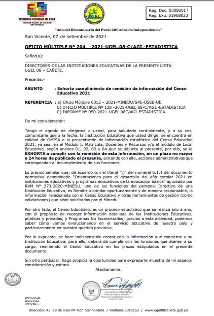 Leer mas...Exhorto cumplimiento de remisión de información del Censo Educativo 2021 DESCARGAR OFICIO: https://drive.google.com/file/d/1kXrv7lkGa5859TU3gYfFqgaIPA9yeKl5/view?usp=sharing