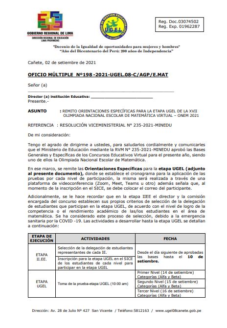 Leer mas...REMITO ORIENTACIONES ESPECÍFICAS PARA LA ETAPA UGEL DE LA XVII OLIMPIADA NACIONAL ESCOLAR DE MATEMÁTICA VIRTUAL – ONEM 2021 DESCARGAR OFICIO: https://drive.google.com/file/d/1OXwgaT91n4WU2LkUV9vEtq_ujWOERF2j/view?usp=sharing