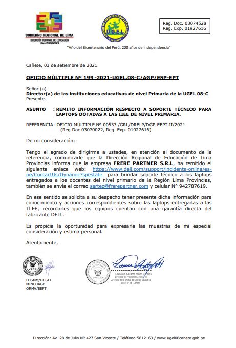 Leer mas...REMITO INFORMACIÓN RESPECTO A SOPORTE TÉCNICO PARA LAPTOPS DOTADAS A LAS IIEE DE NIVEL PRIMARIA. DESCARGAR OFICIO: https://drive.google.com/file/d/1-RBlaOkGzAJTmu0JNiN_USSkOcfa5OiL/view?usp=sharing