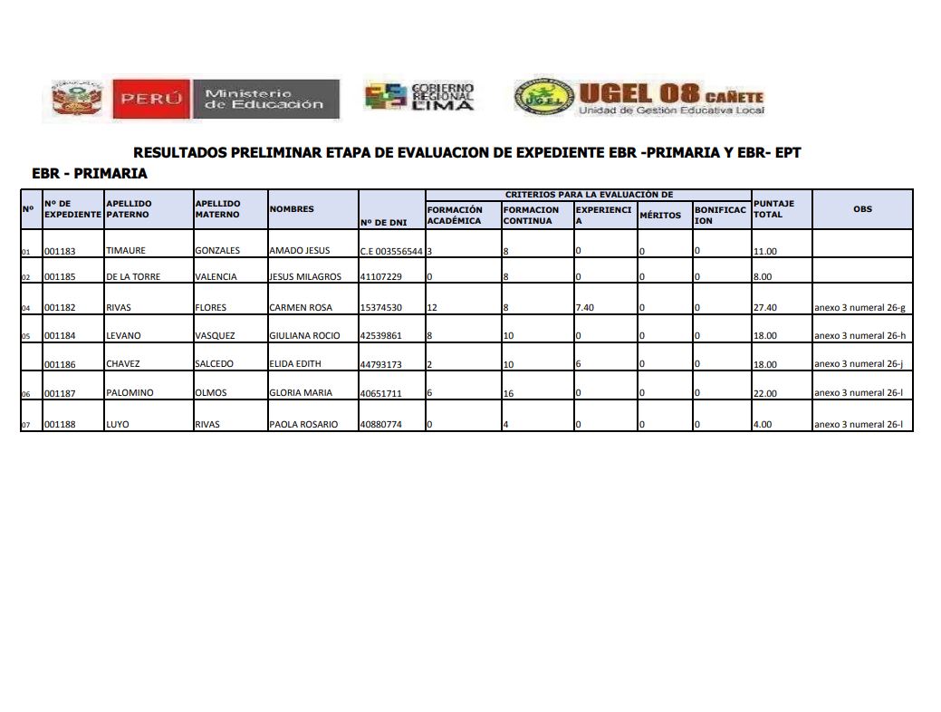 RESULTADOS FINAL DE LA ETAPA DE EVALUACION DE EXPEDIENTE EBE -PRIMARIA