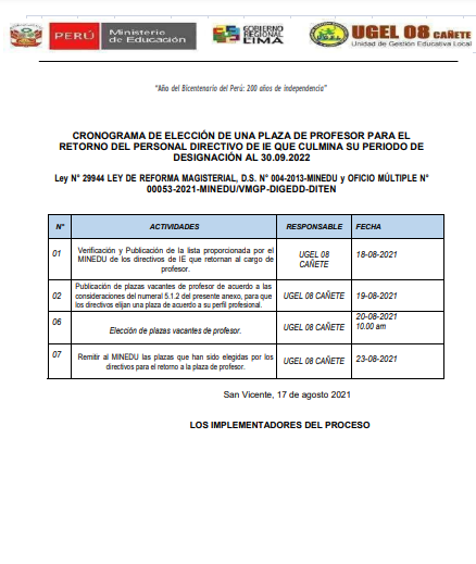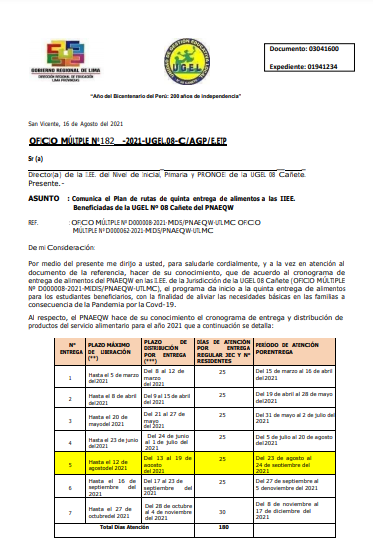 Leer mas...Comunica el Plan de rutas de quinta entrega de alimentos a las IIEE. Beneficiadas de la UGEL Nº 08 Cañete del PNAEQW DESCARGAR OFICIO: https://drive.google.com/file/d/1HQoltnFnWhr1rVtlnnbnNZUTN6PCdQmg/view?usp=sharing