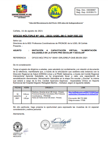 Leer mas...INVITACIÓN A CAPACITACIÓN VIRTUAL “ALIMENTACIÓN SALUDABLE EN LA ETAPA PRE ESCOLAR Y ESCOLAR” DESCARGAR OFICIO: https://drive.google.com/file/d/1HnY0LPFMcVcbg5i_vxZ3sNiuM-ZrfTQ_/view?usp=sharing