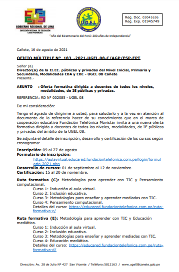 Leer mas...Oferta formativa dirigida a docentes de todos los niveles, modalidades, de IE públicas y privadas. DESCARGAR OFICIO: https://drive.google.com/file/d/1qixz2qETAgQ5aww1SrFIdEFb5-7ePM4Z/view?usp=sharing