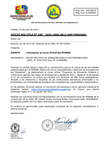 Leer mas...Inscripción al Curso Virtual del PP0068 DESCARGAR OFICIO: https://drive.google.com/file/d/1TTFFejJxspwWWTPj_ooE6LzsUA55EDiH/view?usp=sharing