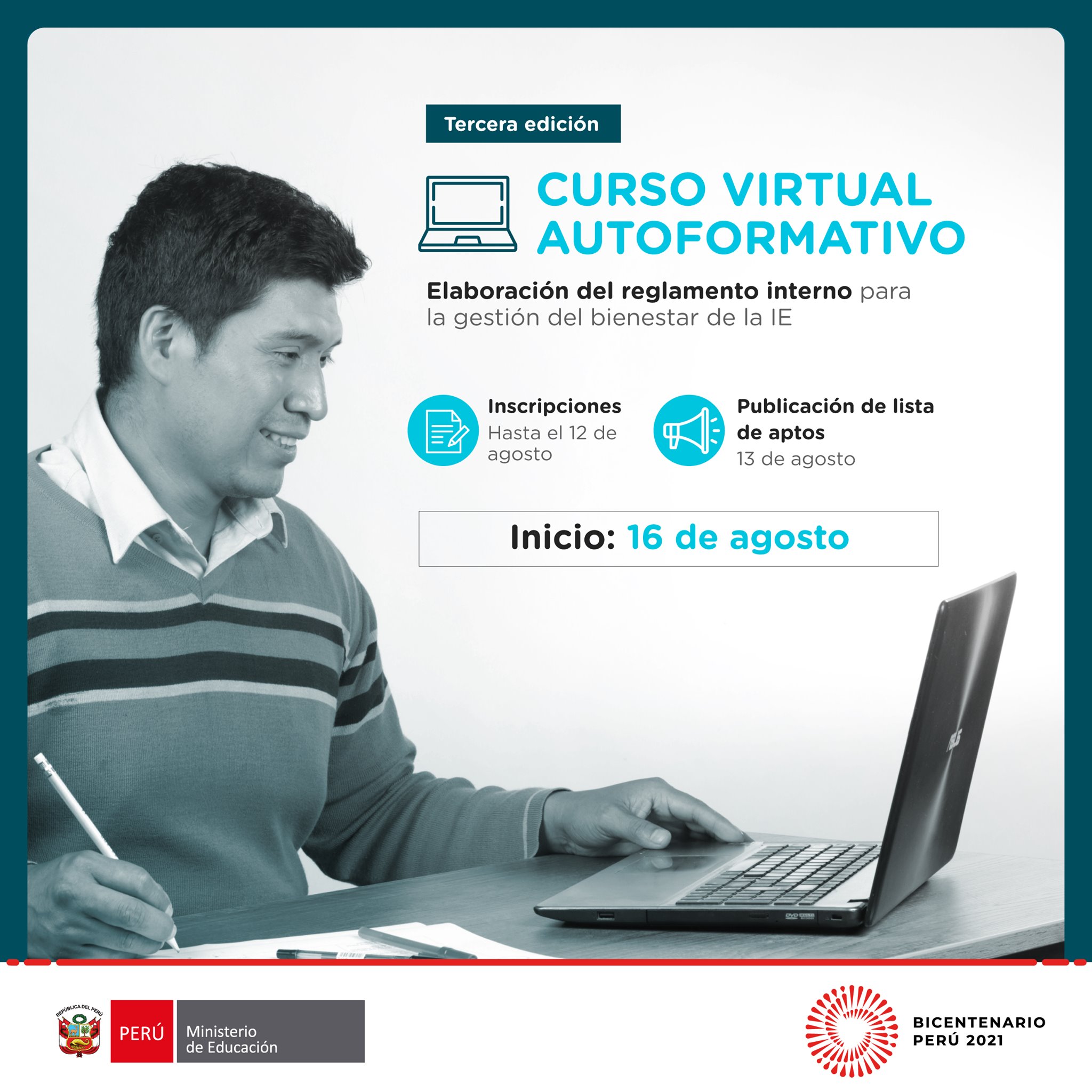 Leer mas...¡Atención, directores/as y docentes! El Ministerio de Educación, a través de la Dirección de Gestión Escolar (DIGE), convoca a la tercera edición del curso virtual autoformativo «Elaboración del Reglamento Interno para la gestión del bienestar de la I. E.» dirigido a directivos y docentes de instituciones educativas de educación básica, así como a especialistas de […]