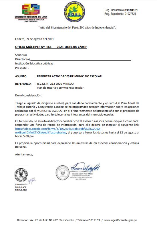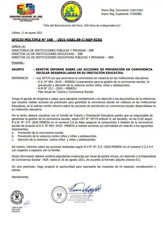 Leer mas...REMITIR INFORME SOBRE LAS ACCIONES DE PREVENCIÓN EN CONVIVENCIA ESCOLAR DESARROLLADAS EN SU INSITUCIÓN EDUCATIVA. DESCARGAR OFICIO: https://drive.google.com/file/d/178QlRNeFzyDMd5lu2GUKo9Ou_hTOfKaK/view?usp=sharing