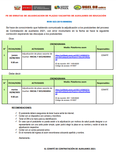 Mié, 11 de agosto, 2021 San Vicente Cañete.Dirigido a Directores , Docentes y Especialistas