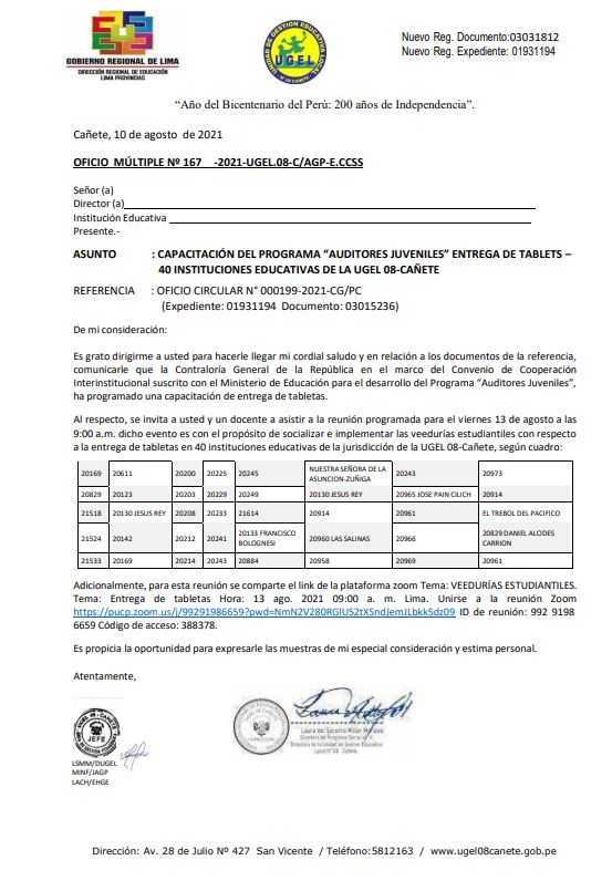 Leer mas...CAPACITACIÓN DEL PROGRAMA “AUDITORES JUVENILES” ENTREGA DE TABLETS – 40 INSTITUCIONES EDUCATIVAS DE LA UGEL 08-CAÑETE DESCARGAR OFICIO: https://drive.google.com/file/d/1LILCOFdLY4qg66RZtuXys27ghV32rdGG/view?usp=sharing
