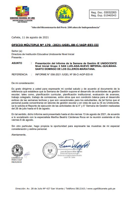 Leer mas...Presentación del Informe de la Semana de Gestión IE UNIDOCENTE Nivel Inicial Grupo 3 SAN LUIS-ASIA-NUEVO IMPERIAL-QUILMANÁSANTO DOMINGO DE LOS OLLEROS-MARIATANA. DESCARGAR OFICIO: https://drive.google.com/file/d/1ZaO3Jc8tl8Bl4z_W_Br6fkCDBFJSULPV/view?usp=sharing