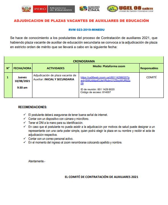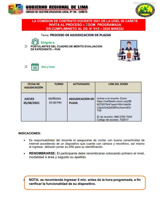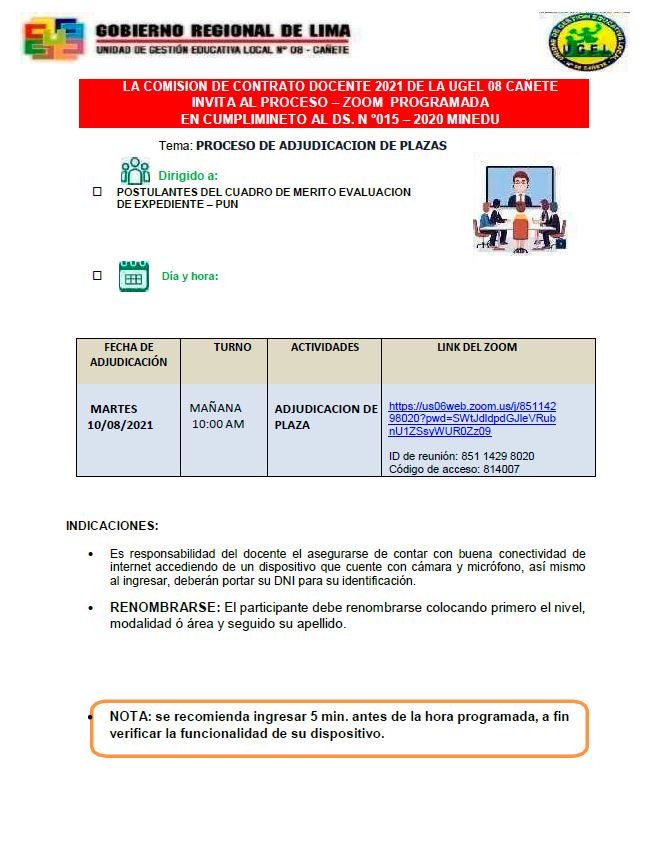 Leer mas...LA COMISION DE CONTRATO DOCENTE 2021 DE LA UGEL 08 CAÑETE INVITA AL PROCESO – ZOOM PROGRAMADA EN CUMPLIMINETO AL DS. N °015 – 2020 MINEDU DESCARGAR ADJUDICACIÓN: https://drive.google.com/file/d/1JoOLcn5kXRFT3Ou2X2J1Ivn_kYvuMlEM/view?usp=sharing