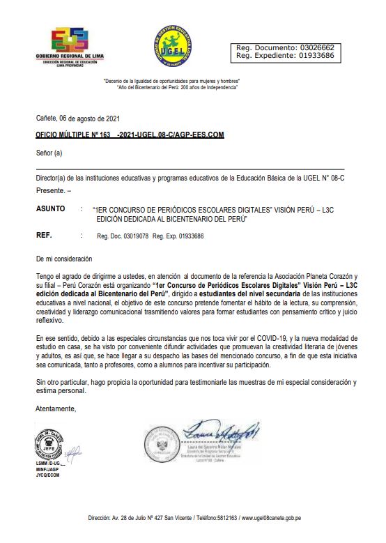 Leer mas...“1ER CONCURSO DE PERIÓDICOS ESCOLARES DIGITALES” VISIÓN PERÚ – L3C EDICIÓN DEDICADA AL BICENTENARIO DEL PERÚ” DESCARGAR OFICIO: https://drive.google.com/file/d/1AryaTPhfxMme8qEiw784BICtgEZF7zEl/view?usp=sharing