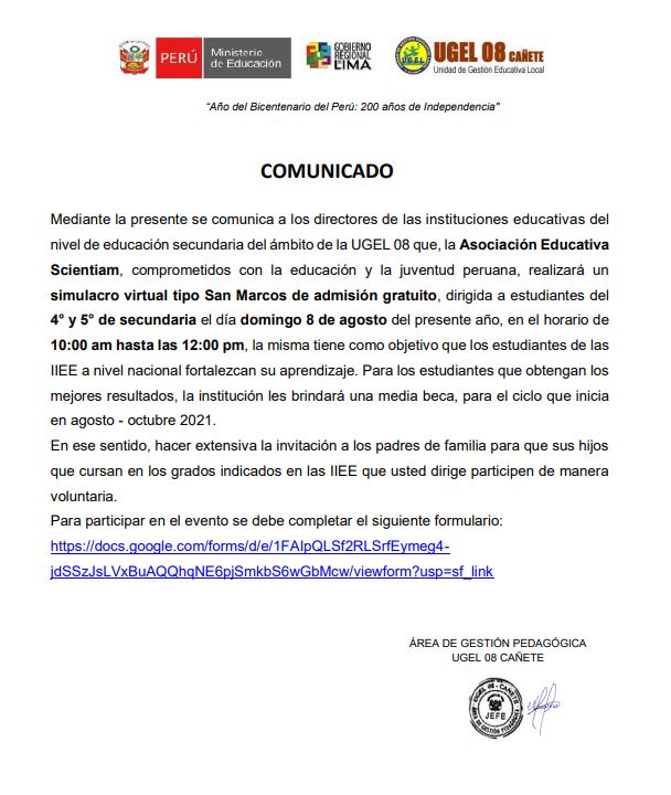 Leer mas...Mediante la presente se comunica a los directores de las instituciones educativas del nivel de educación secundaria del ámbito de la UGEL 08 que, la Asociación Educativa Scientiam, comprometidos con la educación y la juventud peruana, realizará un simulacro virtual tipo San Marcos de admisión gratuito, dirigida a estudiantes del 4° y 5° de secundaria […]
