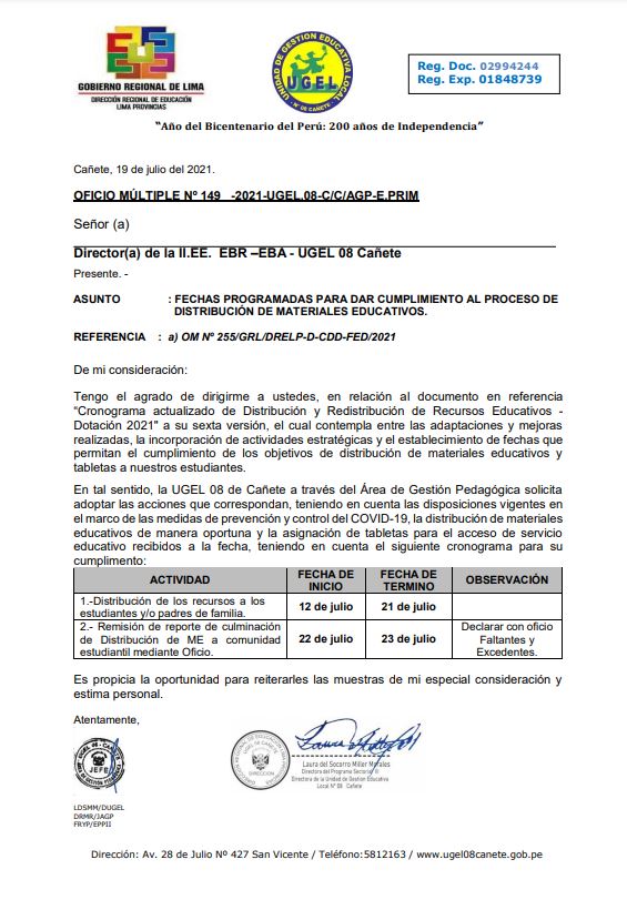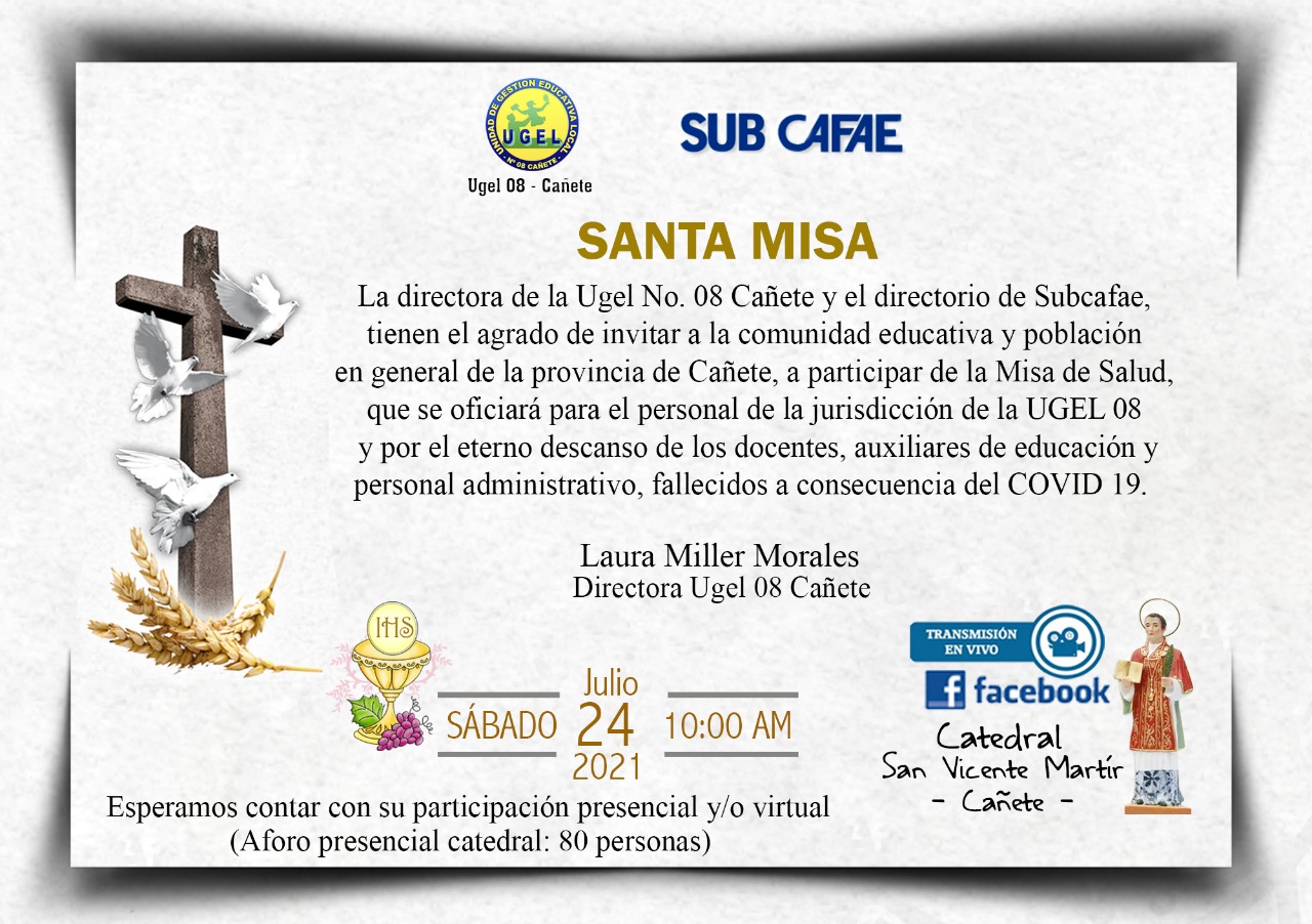 Jue, 22 de julio, 2021 San Vicente Cañete.POR QUIENES PARTIERON A LA ETERNIDAD Y LA SALUD DEL PERSONAL DE LA UGEL 08 DE CAÑETE. SANTA MISA SABADO 24 JULIO / 10:00 AM CATEDRAL DE SAN VICENTE MARTÍR – CAÑETE. GRACIAS POR ACOMPAÑARNOS.