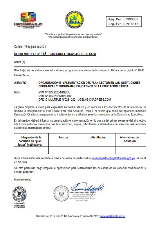 Lun, 19 de julio, 2021 San Vicente Cañete.ORGANIZACIÓN E IMPLEMENTACIÓN DEL PLAN LECTOR EN LAS INSTITUCIONES EDUCATIVAS Y PROGRAMAS EDUCATIVOS DE LA EDUCACIÓN BÁSICA. DESCARGAR OFICIO: https://drive.google.com/file/d/1TYX9gDnCQmH-MhFxI_PVIqS054PhGoYF/view?usp=sharing