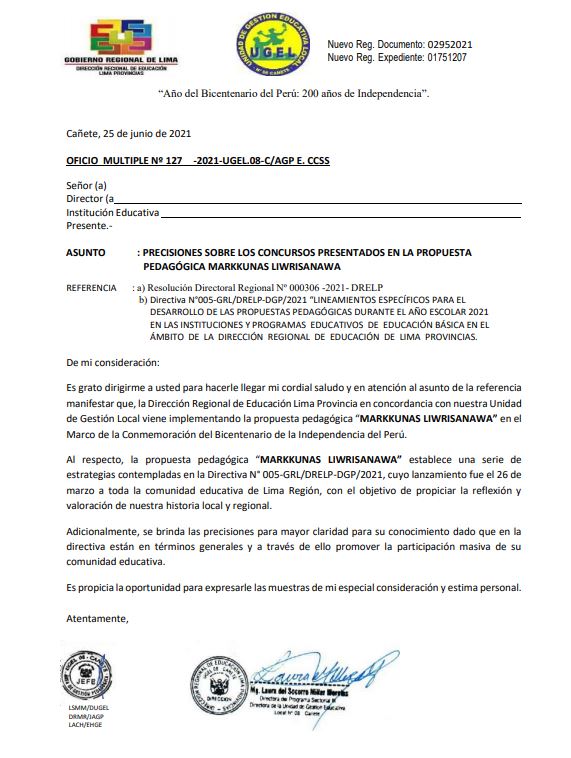 Vie, 25 de junio, 2021 San Vicente Cañete.PRECISIONES SOBRE LOS CONCURSOS PRESENTADOS EN LA PROPUESTA PEDAGÓGICA MARKKUNAS LIWRISANAWA DESCARGAR OFICIO: https://drive.google.com/file/d/1XAM7COjMVXgfQEwhyQ1K4bWdBxa9QIg2/view?usp=sharing