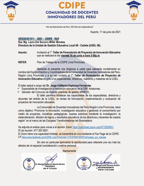 Invitación al 1° Taller de Formulación de Proyectos de Innovación Educativa que se realizará el día viernes 18 de junio a hora 5:00p.m. DESCARGAR OFICIO: https://drive.google.com/file/d/1LBydOIDoqJi21KdNaZSlHvmmMgpZF8x7/view?usp=sharing