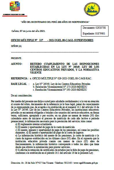 Leer mas...REITERO CUMPLIMIENTO DE LAS DISPOSICIONES ESTABLECIDAS EN LA LEY N° 26549, LEY DE LOS CENTROS EDUCATIVOS PRIVADOS, Y LA NORMATIVA VIGENTE DESCARGAR OFICIO: https://drive.google.com/file/d/1zia0Lvk5Ci_qx2mrGGLU_YGremkseqb6/view?usp=sharing