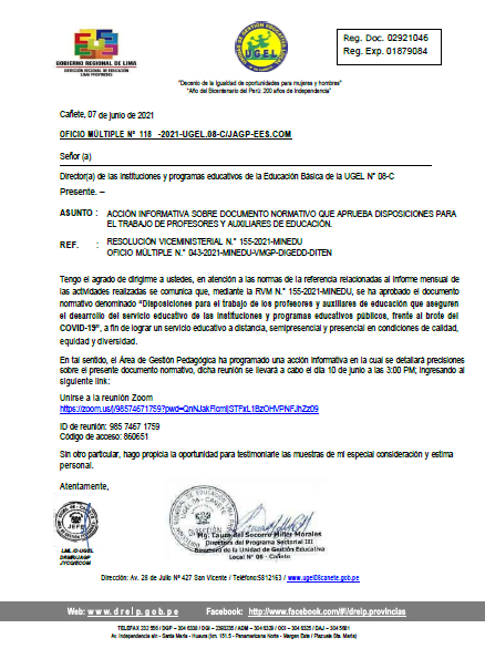 Leer mas...ACCIÓN INFORMATIVA SOBRE DOCUMENTO NORMATIVO QUE APRUEBA DISPOSICIONES PARA EL TRABAJO DE PROFESORES Y AUXILIARES DE EDUCACIÓN DESCARGAR OFICIO: https://drive.google.com/file/d/189KMNXTOd50PDzxXj0LZHsW5Eh7F5k7V/view?usp=sharing