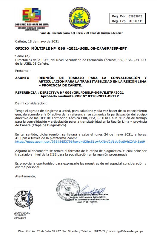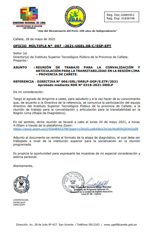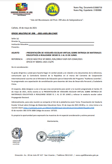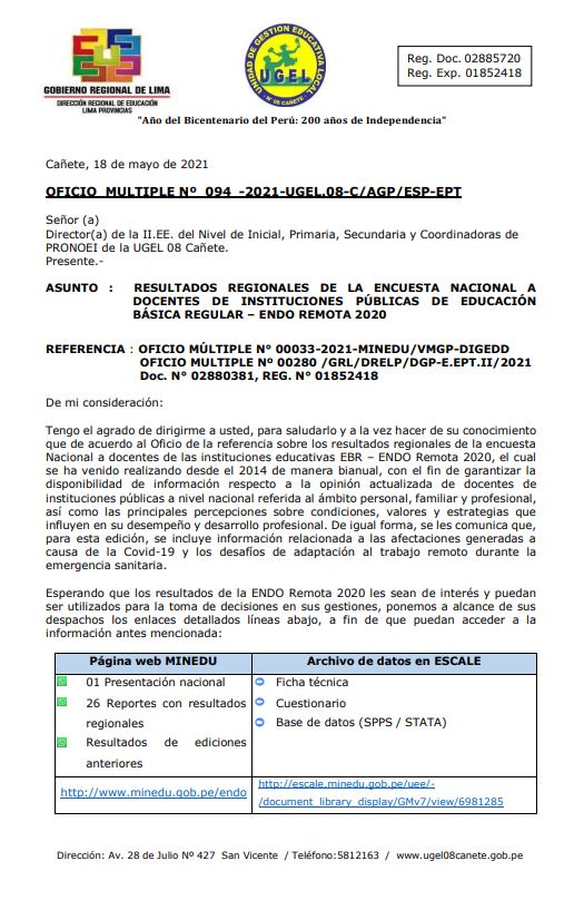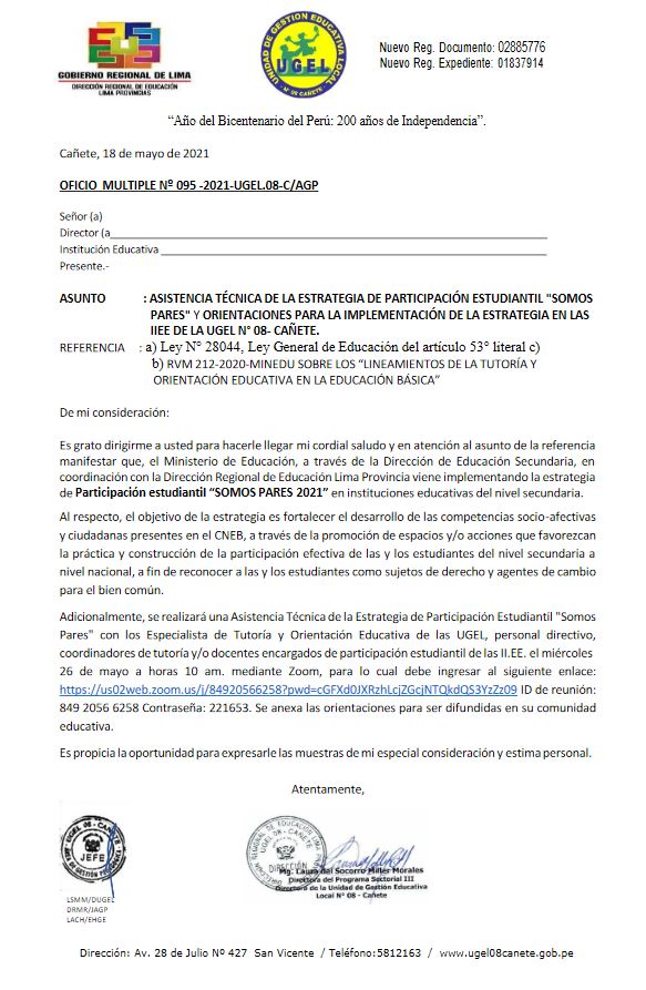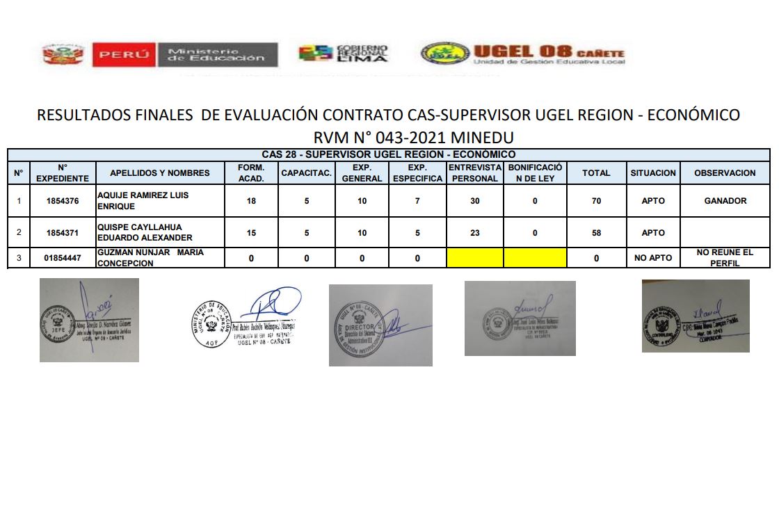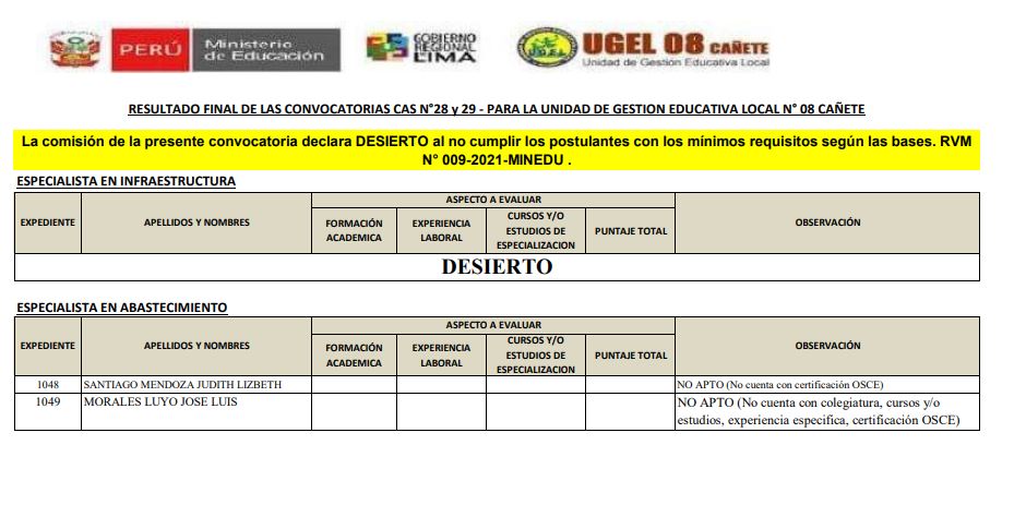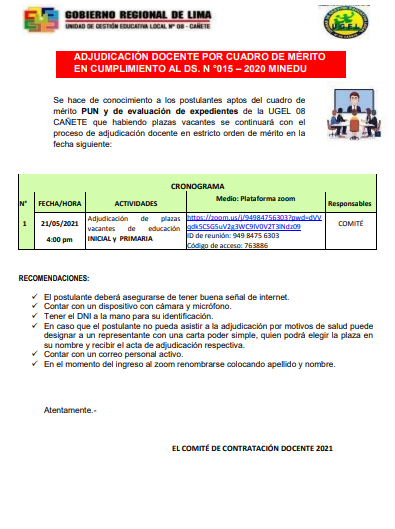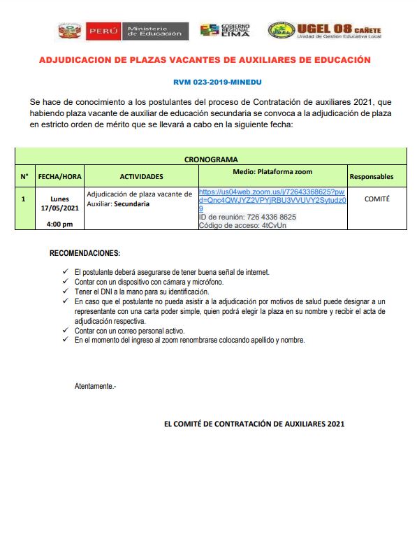 Vie, 21 de mayo, 2021 San Vicente Cañete.Se hace de conocimiento a los postulantes aptos del cuadro de mérito PUN y de evaluación de expedientes de la UGEL 08 CAÑETE que habiendo plazas vacantes se continuará con el proceso de adjudicación docente en estricto orden de mérito DESCARGAR ADJUDICACIÓN: https://drive.google.com/file/d/1ToCz4gIwQbBWxTbZ9QwrsAwBYUZN2uFj/view?usp=sharing