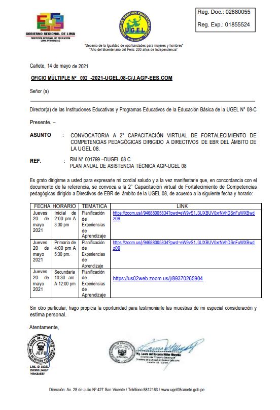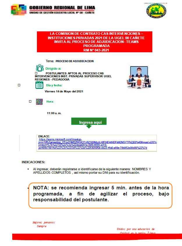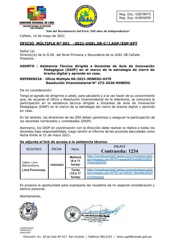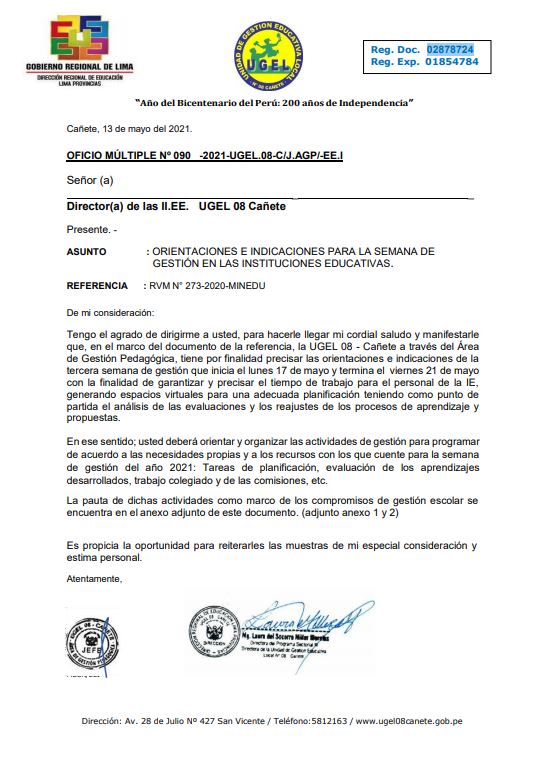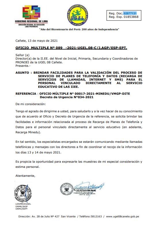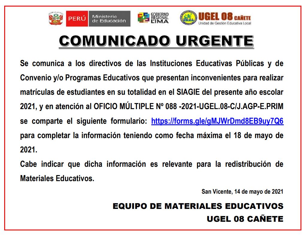 Vie, 14 de mayo, 2021 San Vicente Cañete.Se comunica a los directivos de las Instituciones Educativas Públicas y de Convenio y/o Programas Educativos que presentan inconvenientes para realizar matrículas de estudiantes en su totalidad en el SIAGIE del presente año escolar 2021, y en atención al OFICIO MÚLTIPLE Nº 088 -2021-UGEL.08-C/J.AGP-E.PRIM se comparte el siguiente formulario: https://forms.gle/gMJWrDmd8EB9uy7Q6 para completar la información teniendo […]