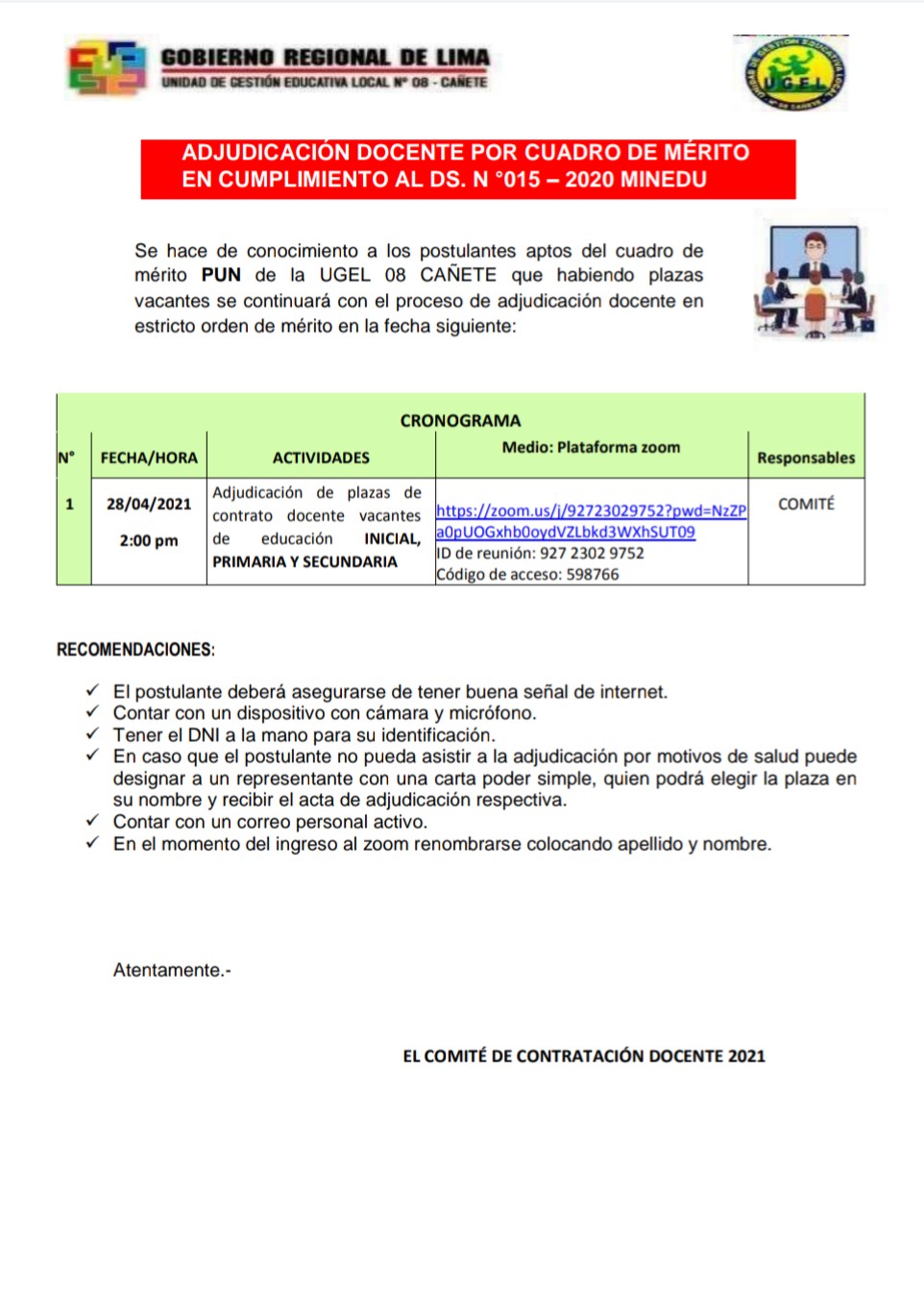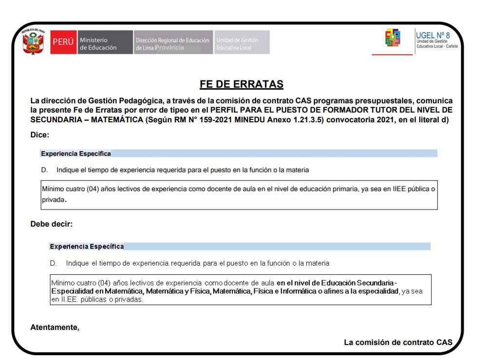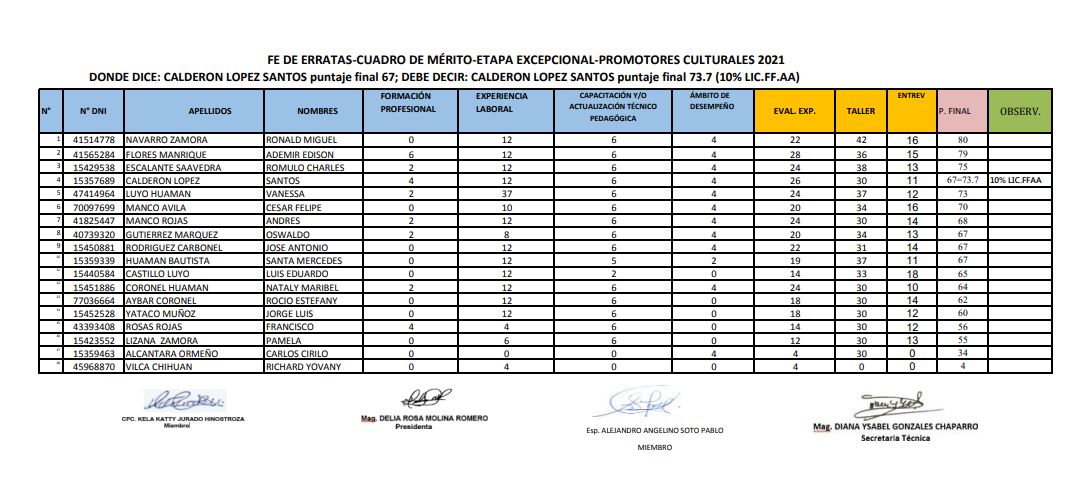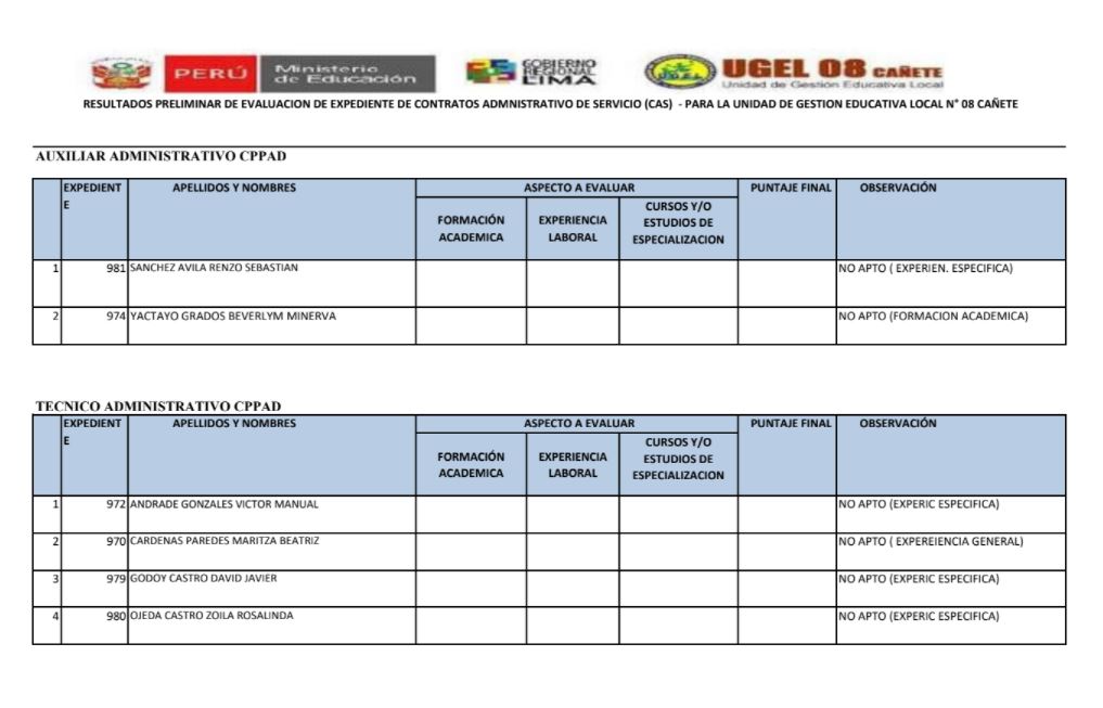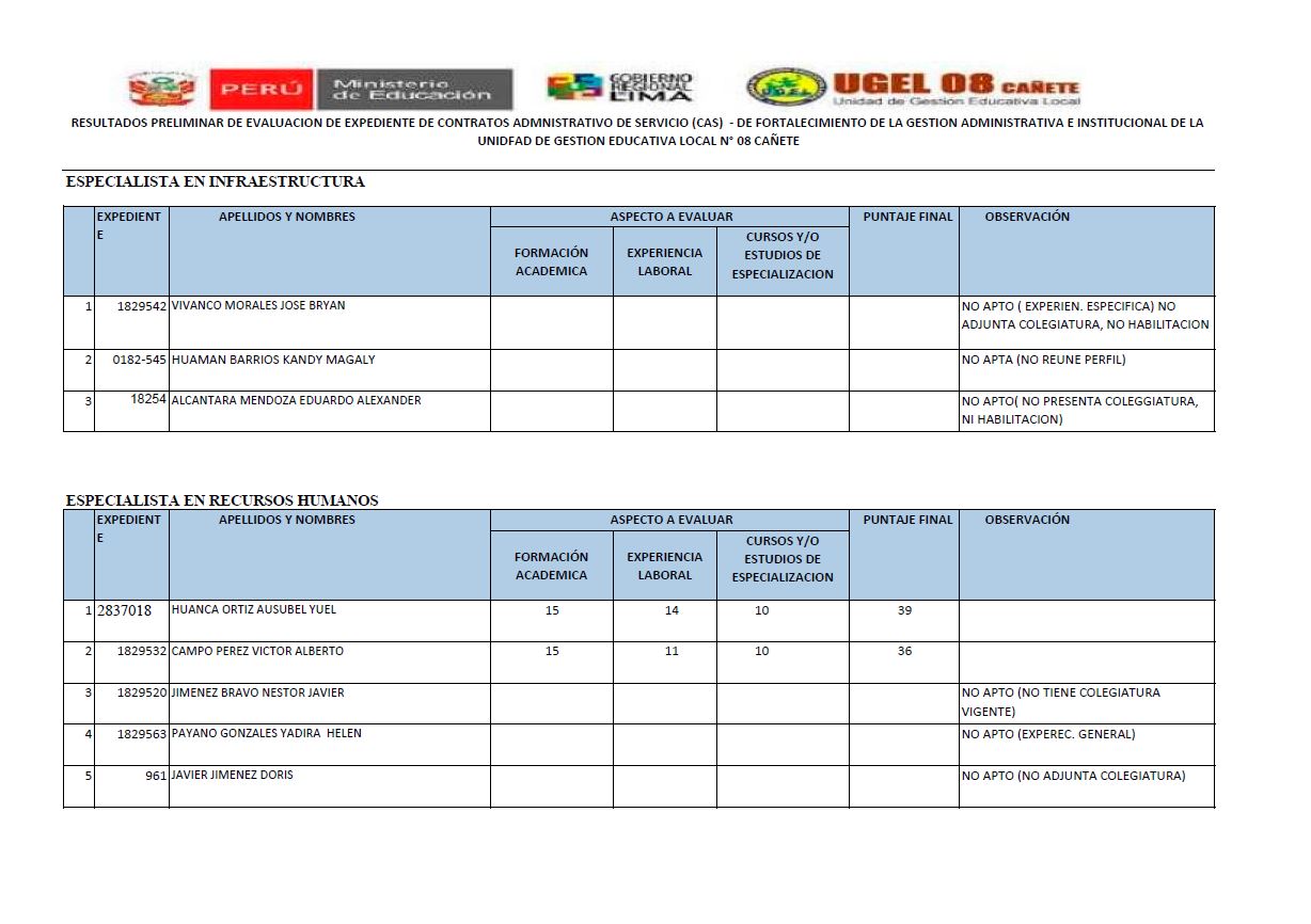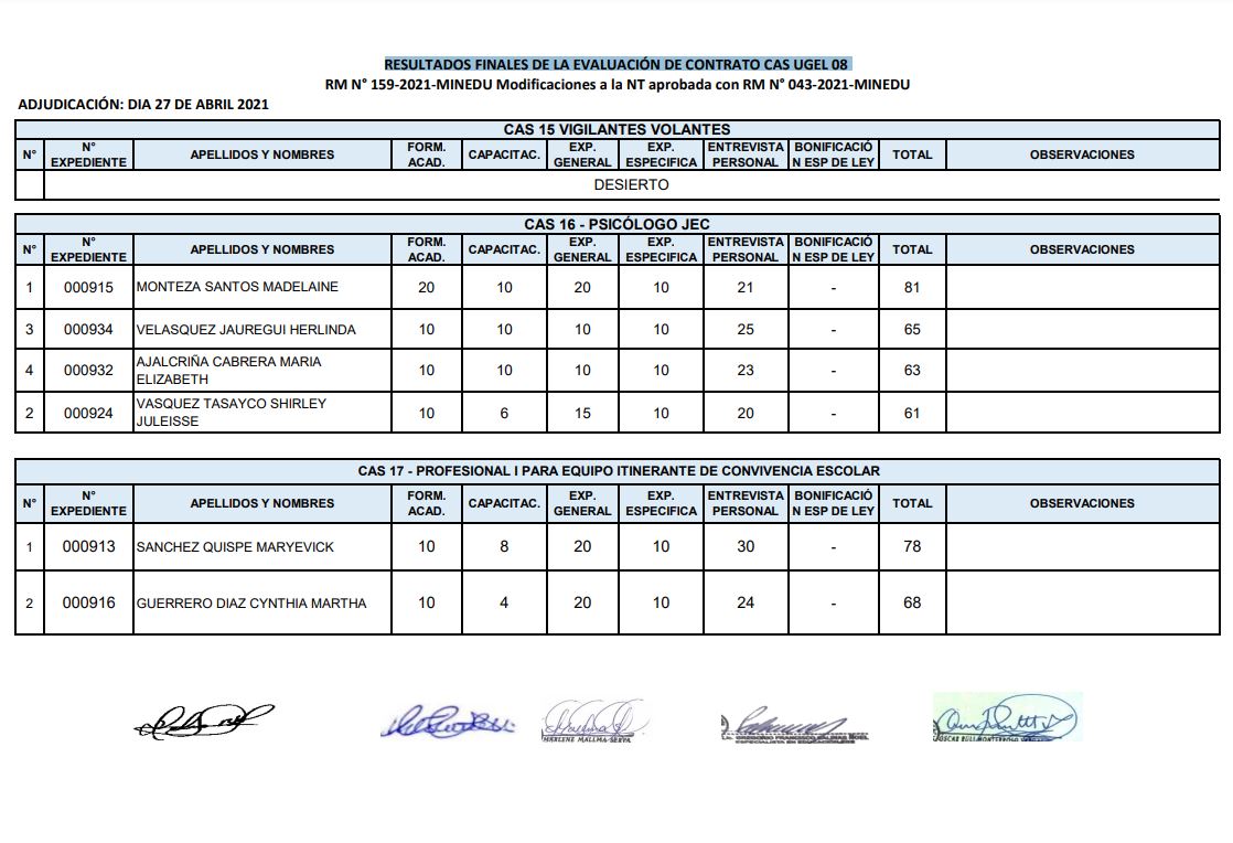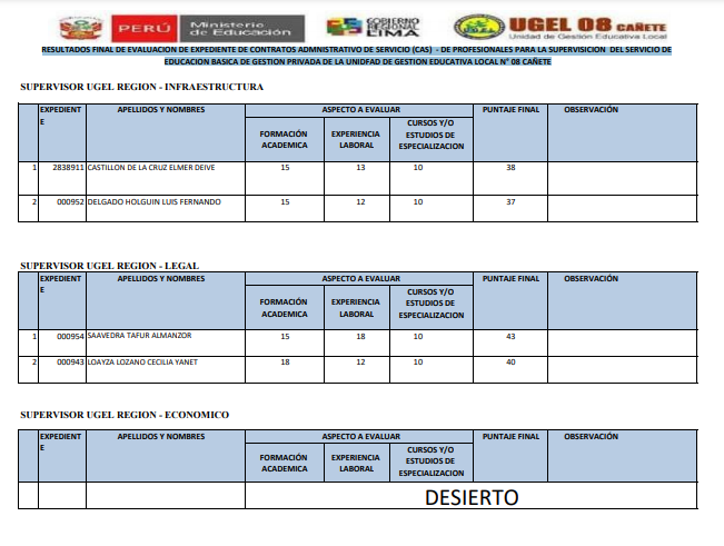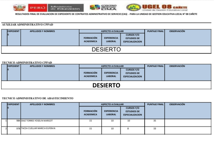 RESULTADOS FINAL DE EVALUACIÓN DE EXPEDIENTE DE CONTRATOS ADMNISTRATIVO DE SERVICIO (CAS) – PARA LA UNIDAD DE GESTIÓN EDUCATIVA LOCAL N° 08 CAÑETE