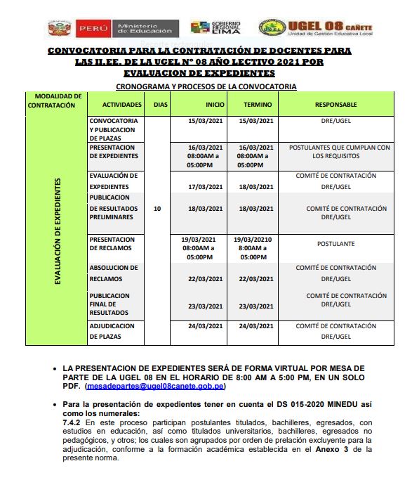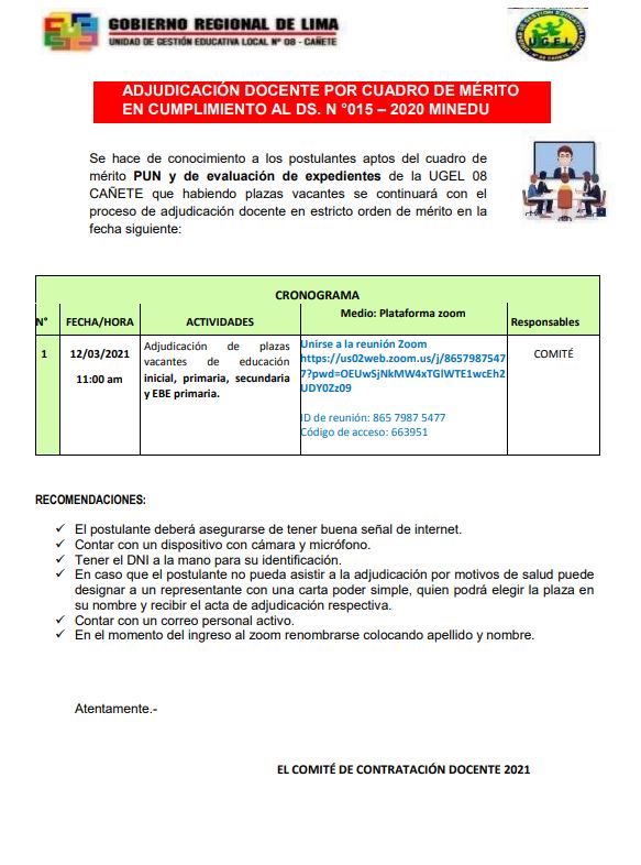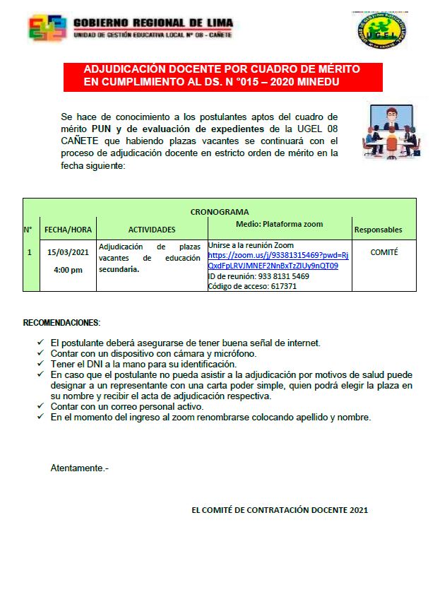 Leer mas...Se hace de conocimiento a los postulantes aptos del cuadro de mérito PUN y de evaluación de expedientes de la UGEL 08 CAÑETE que habiendo plazas vacantes se continuará con el proceso de adjudicación docente en estricto orden de mérito DESCARGAR ADJUDICACIÓN: https://drive.google.com/file/d/1tRHoOia6vzwNRIddTwAiVdyvo0-S2BYg/view?usp=sharing