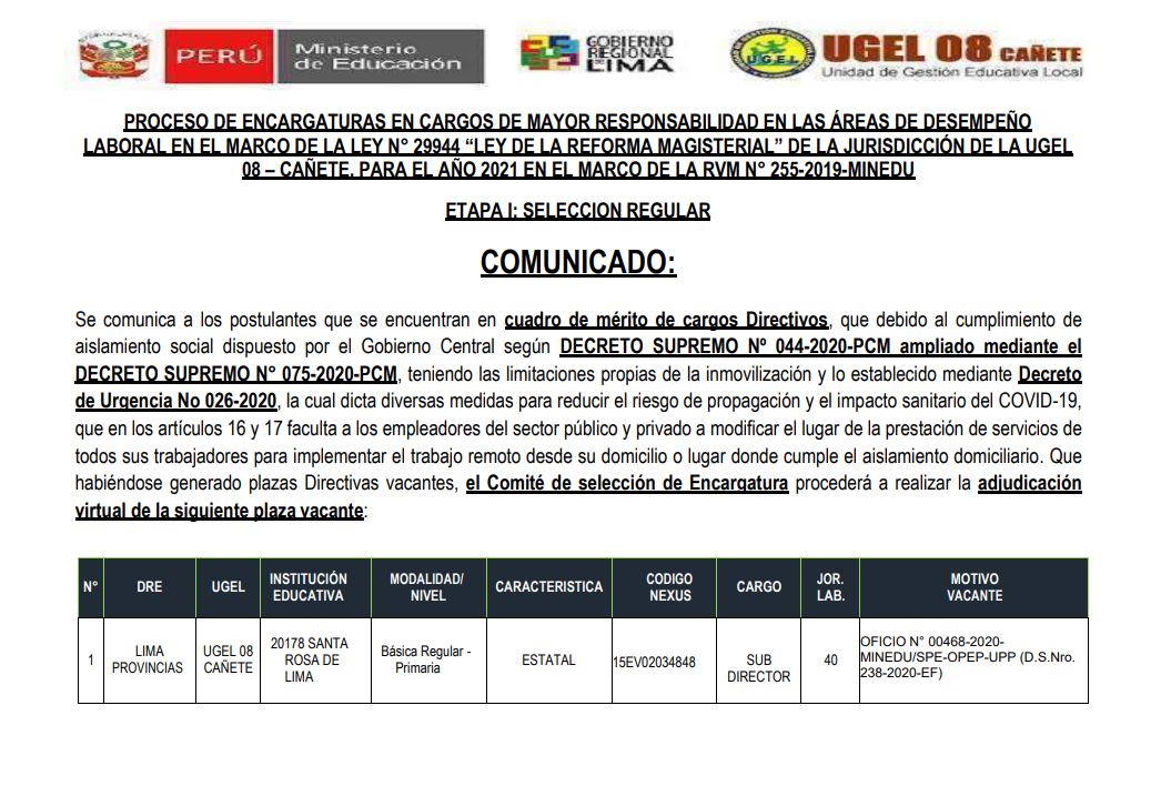 Leer mas...PROCESO DE ENCARGATURAS EN CARGOS DE MAYOR RESPONSABILIDAD EN LAS ÁREAS DE DESEMPEÑO LABORAL EN EL MARCO DE LA LEY N° 29944 “LEY DE LA REFORMA MAGISTERIAL” DE LA JURISDICCIÓN DE LA UGEL 08 – CAÑETE, PARA EL AÑO 2021 EN EL MARCO DE LA RVM N° 255-2019-MINEDU DESCARGAR COMUNICADO: https://drive.google.com/file/d/1fqBAitqLHTO9h2e-Fuo8K7k-pPVSiMLT/view?usp=sharing DESCARGAR LINK: https://drive.google.com/file/d/15n-dnje2FNhu4XeFT3Z01Ymy-XV_0LQY/view?usp=sharing DESCARGAR […]