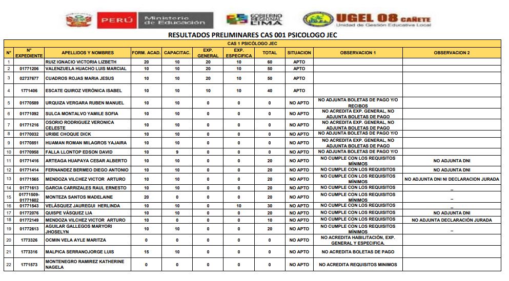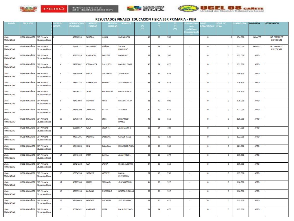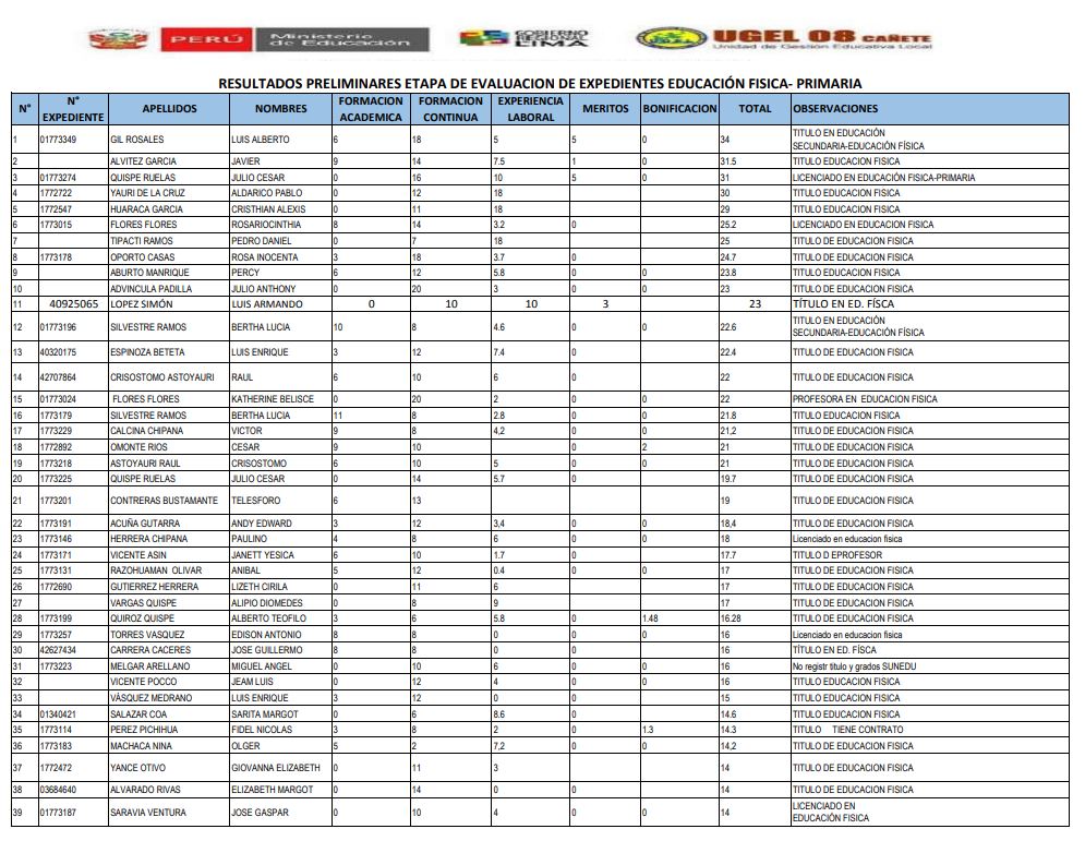 RESULTADOS PRELIMINARES DE EVALUACIÓN DE EXPEDIENTE – EDUCACIÓN FÍSICA EBR PRIMARIA