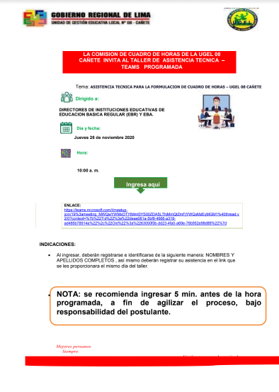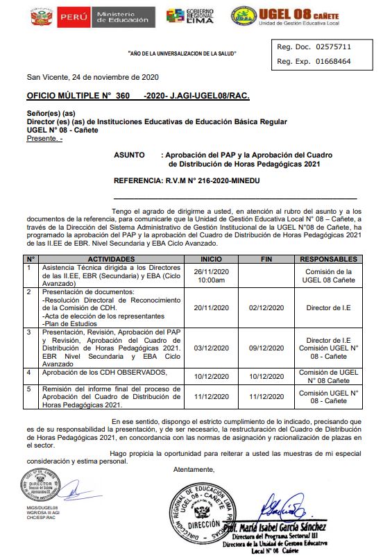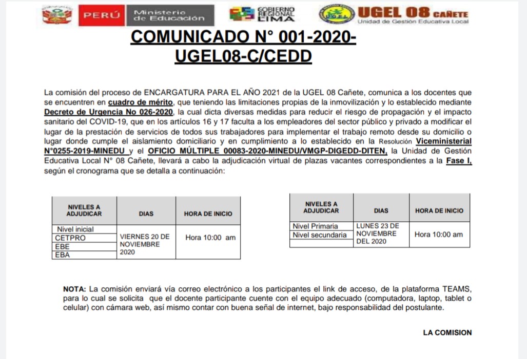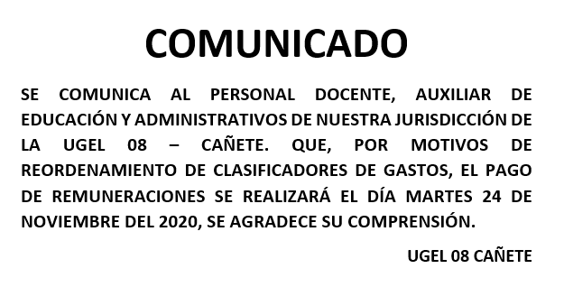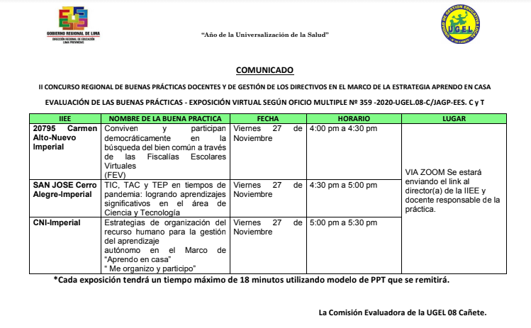 Mié, 25 de noviembre, 2020 San Vicente Cañete.ASISTENCIA TÉCNICA PARA LA FORMULACIÓN DE CUADRO DE HORAS – UGEL 08 CAÑETE DESCARGAR COMUNICADO: https://drive.google.com/file/d/12DwLPxD4-My33KGoLEkGhmFXc8CJx2IT/view?usp=sharing