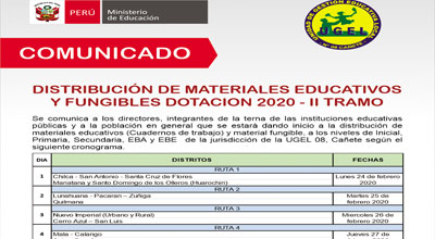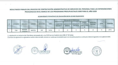 Jue, 20 de febrero, 2020 San Vicente Cañete.En los ambientes de la Unidad de Gestiòn Educativa Local Nº 08 de Cañete, se llevò a cabo la adjudicaciòn de plazas del Proceso de Contrataciòn Administrativa de Servicios del Personal para las Intervenciones Pedagògicas en el marco de los programas presupuestales 0090 para el año 2020. El acto fue presidido por el presidente de […]