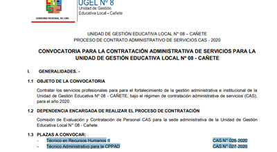 Lun, 9 de marzo, 2020 San Vicente Cañete.CONVOCATORIA PARA LA CONTRATACIÓN ADMINISTRATIVA DE SERVICIOS PARA LA UNIDAD DE GESTIÓN EDUCATIVA LOCAL Nº 08 – CAÑETE – Técnico en Recursos Humanos II CAS N° 026-2020– Técnico Administrativo para la CPPAD CAS N° 027-2020 Descargar: https://drive.google.com/file/d/1mY-uNpmjMc08InnWMVC6BKU_9aH_kHAe/view?usp=sharing