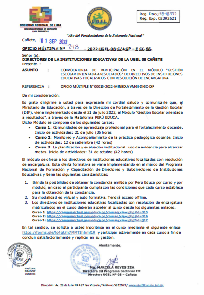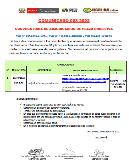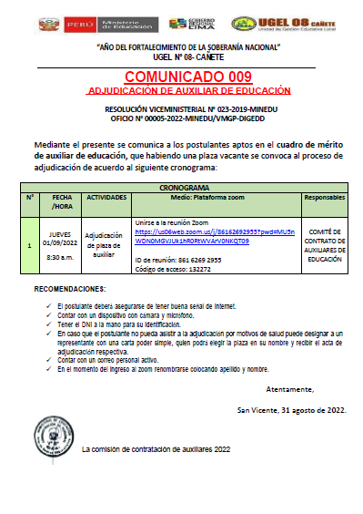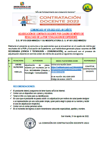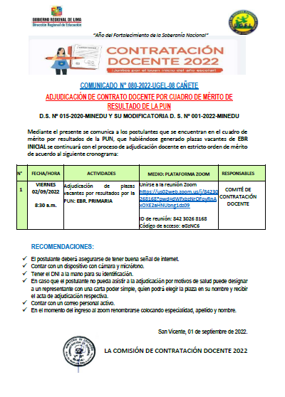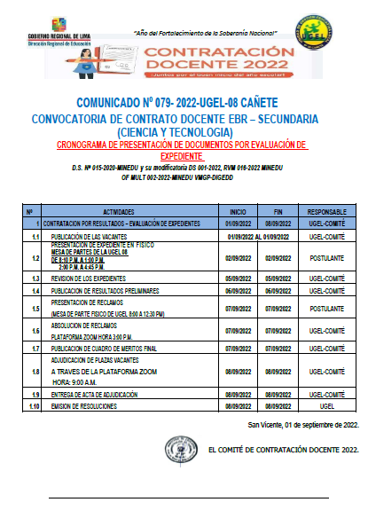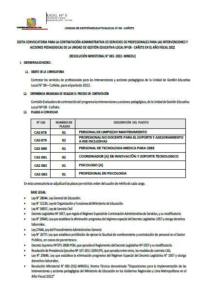 SEXTA CONVOCATORIA PARA LA CONTRATACIÓN ADMINISTRATIVA DE SERVICIOS DE PROFESIONALES PARA LAS INTERVENCIONES Y ACCIONES PEDAGOGICAS DE LA UNIDAD DE GESTIÓN EDUCATIVA LOCAL Nº 08 – CAÑETE EN EL AÑO FISCAL 2022