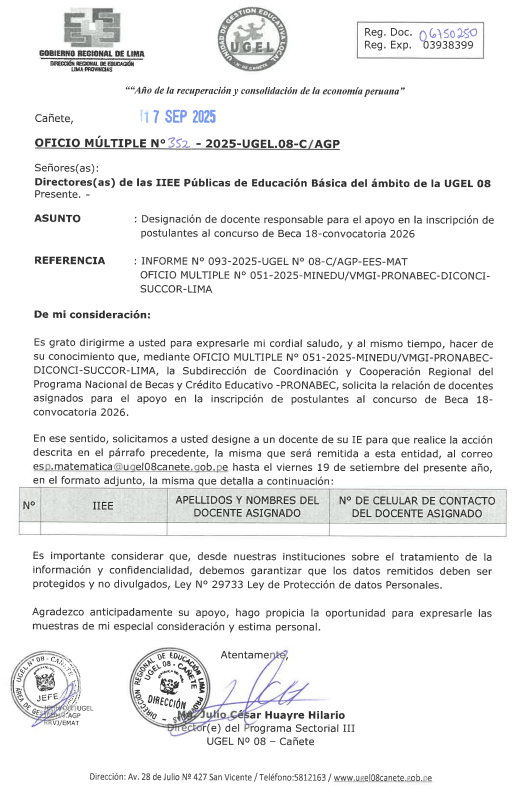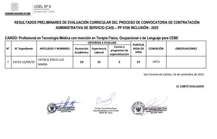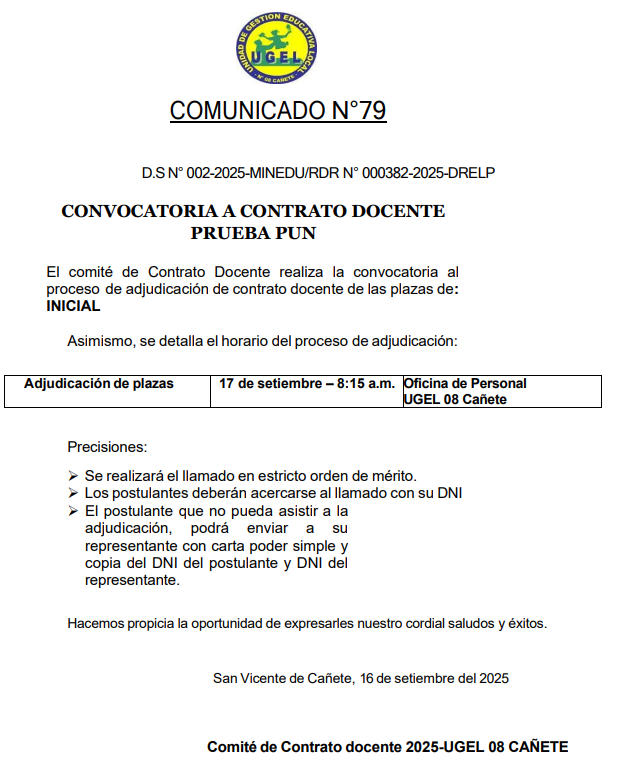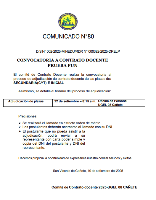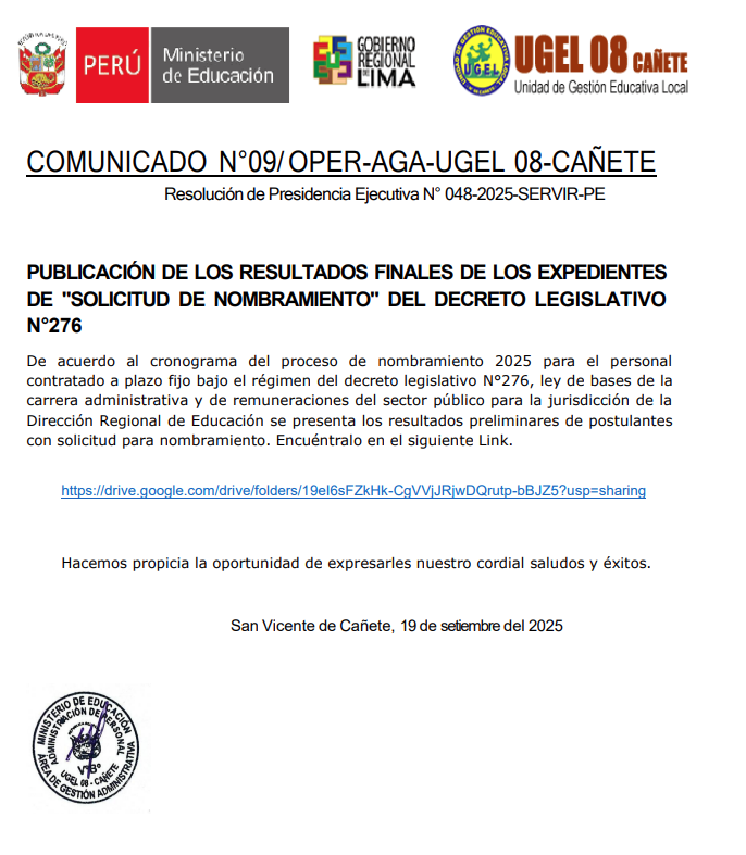 Vie, 19 de septiembre, 2025 San Vicente Cañete.La UGEL 08 Cañete informa que, de acuerdo al cronograma del proceso de nombramiento 2025 para el personal contratado a plazo fijo bajo el régimen del Decreto Legislativo N° 276, se publican los resultados finales de los expedientes de solicitud de nombramiento. 🔗 Consulte el comunicado completo y los resultados en el siguiente enlace: https://drive.google.com/drive/folders/19eI6sFZkHk-CgVVjJRjwDQrutp-bBJZ5?usp=sharing