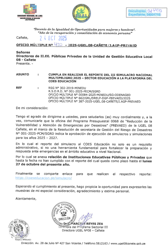 Vie, 24 de octubre del 2025, 8:24 PM por UGEL 08 CAÑETE💁Se comparte Oficio Múltiple 420-2025-UGEL.08-CAÑETE/J.AGP-PREVAED. de cumplimiento al reporte al COES Educación del III Simulacro Nacional Multipeligro 2025 – Educación.