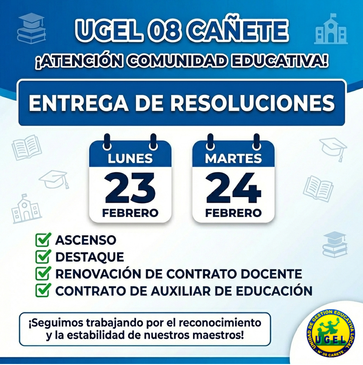 Vie, 20 de febrero del 2026, 8:47 PM por UGEL 08 CAÑETELa UGEL 08 Cañete comunica a los docentes y auxiliares de educación que se llevará a cabo la entrega presencial de resoluciones administrativas.