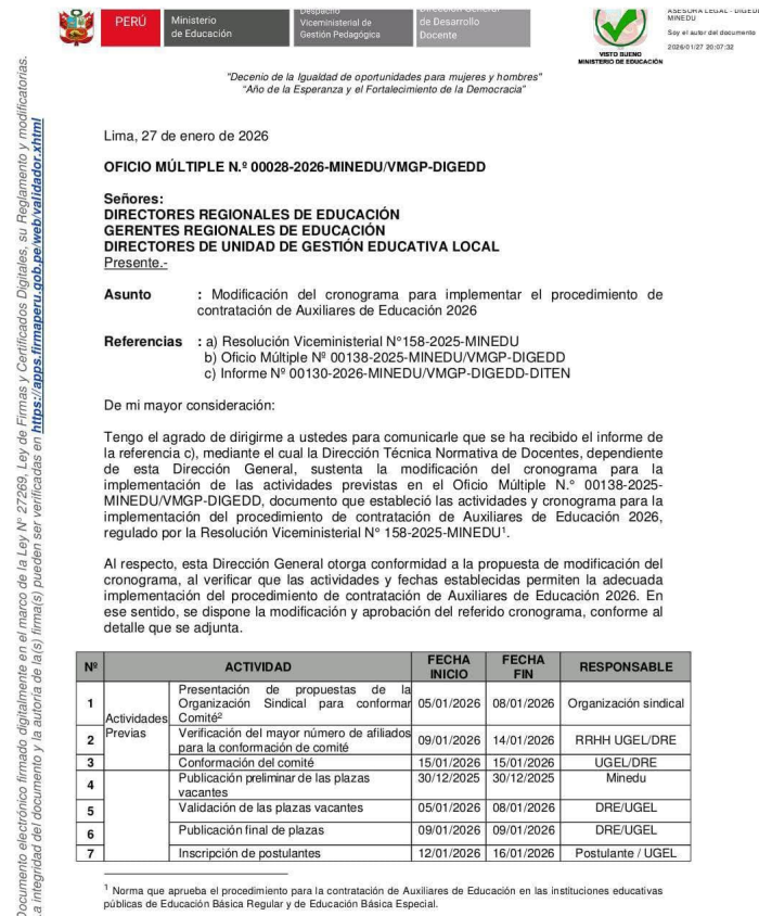 Vie, 30 de enero del 2026, 12:06 PM por UGEL 08 CAÑETEEl Ministerio de Educación ha emitido el Oficio Múltiple N° 00028-2026-MINEDU/VMGP-DIGEDD, mediante el cual se aprueba la modificación del cronograma para la implementación del procedimiento de contratación de Auxiliares de Educación 2026.