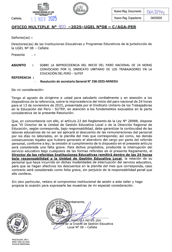 Jue, 13 de noviembre del 2025, 10:54 AM por UGEL 08 CAÑETELa UGEL N.º 08 Cañete comunica a los directores(as) de las Instituciones Educativas y Programas Educativos de la jurisdicción sobre la improcedencia del inicio del paro nacional de 24 horas, convocado por el Sindicato Unitario de los Trabajadores en la Educación del Perú – SUTEP, conforme a lo dispuesto en la Resolución de Secretaría General N.º 238-2025-MINEDU.